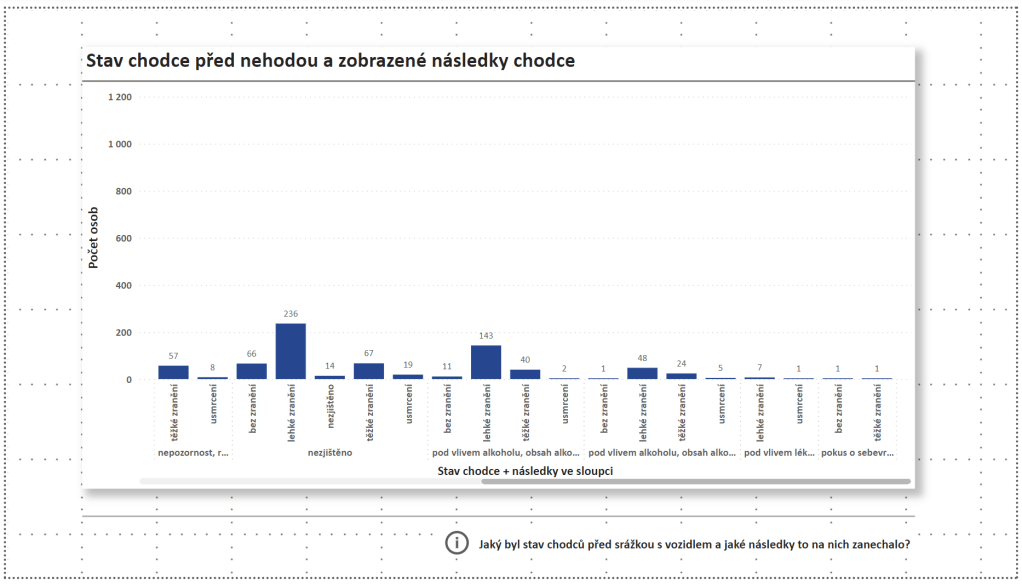 ⮕ nejčastější předchozí stav chodce a následky: dobrý – vyvázl s lehkými zraněními (ale i velká míra těžkých zraněních. Musíme dávat do kontextu i to, že nejvíce lidí je ze statistického hlediska v pořádku, proto by stálo za zmínku na data nahlížet i z pohledu, jak jsou mezi sebou v poměru v rámci stavu osob, například lidí na vozíčku. Těžká zranění můžeme vidět ve skupině pod vlivem alkoholu do 0,99 ‰, kde tvoří zhruba pouze o polovinu méně vůči lehkým zraněním.