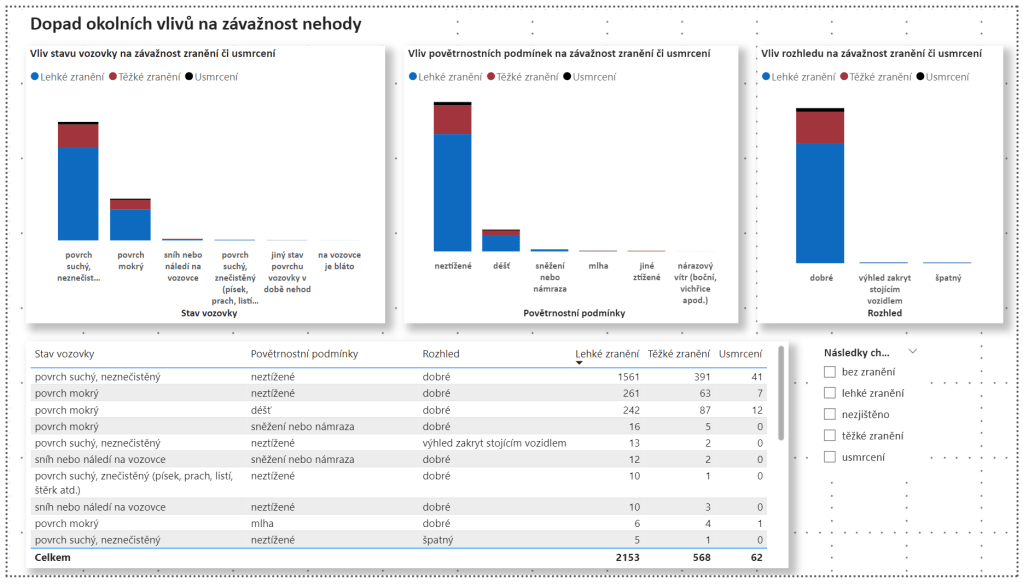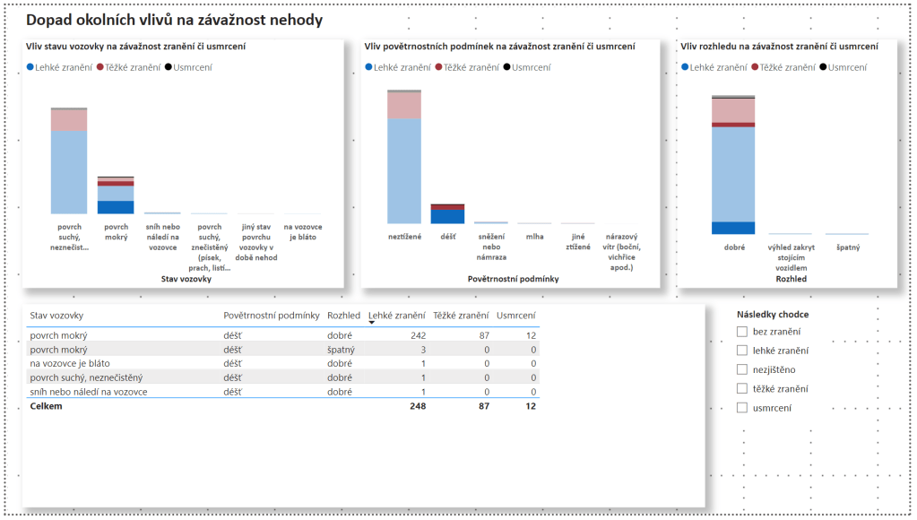 ⮕ Analýza dat týkajících se vztahu mezi těžkými a lehkými zraněními a úmrtími při dopravních nehodách společně s vnějšími faktory, jako jsou stav vozovky, povětrnostní podmínky a rozhled, je komplexní. Odpověď na tuto stanovenou otázku je tak vícevrstvá a závisí na interakci různých faktorů.