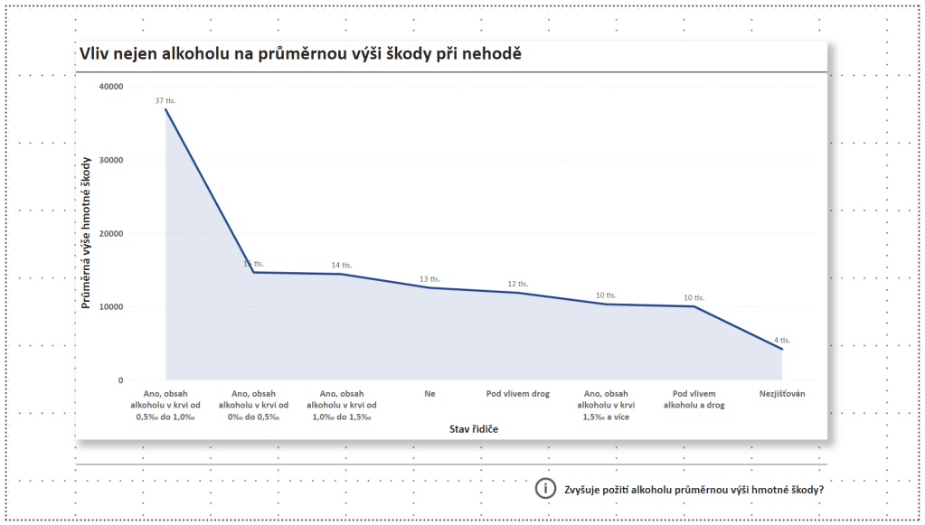 ⮕ Ano, ale i ne. Jak si lze z grafu všimnout, nejvíce průměrné hmotné škody bylo spácháno při obsahu alkoholu v krvi od 0,5‰ do 1,0 ‰. Naproti tomu, při obsahu 1,5‰ a více, nebo také pod vlivem alkoholu i drog, je průměrná škoda celkově zvlášť o něco nižší, než v případě, kdy byl stav řidiče bez jakýchkoli návykových látek.