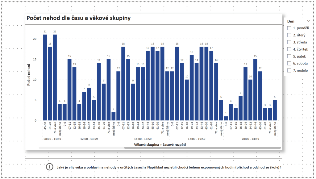 ⮕ Nejvyšší nehodovost je u lidí ve věku 33-44 let a 71 a více let v časovém rozmezí 8:00 až 11:59. V případě nezletilích v čase příchodu a odchodu ze školy je ve srovnání s ostatními věkovými skupinami nejvíce v čase 12:00 až 13:59, 14:00 až 16:59 a 17:00 až 19:59, přičemž v posledních dvou časových rozmezích je celková nehodovost vyšší. U grafu je také možnost filtrovat výsledky dle dnu v týdnu.
